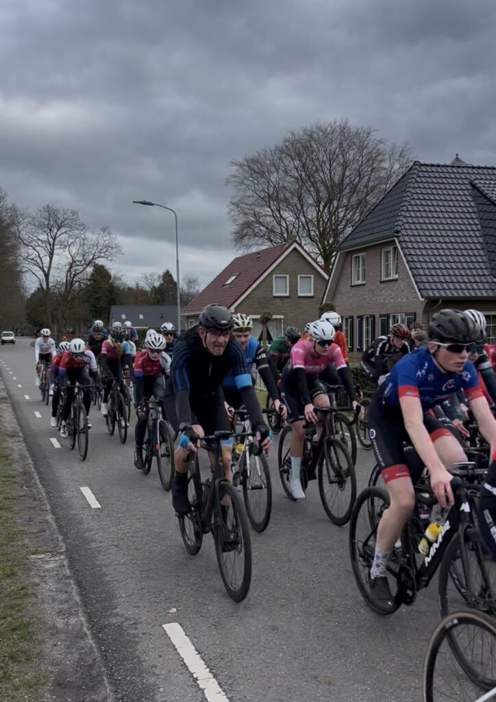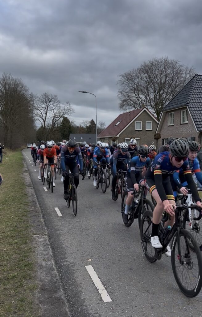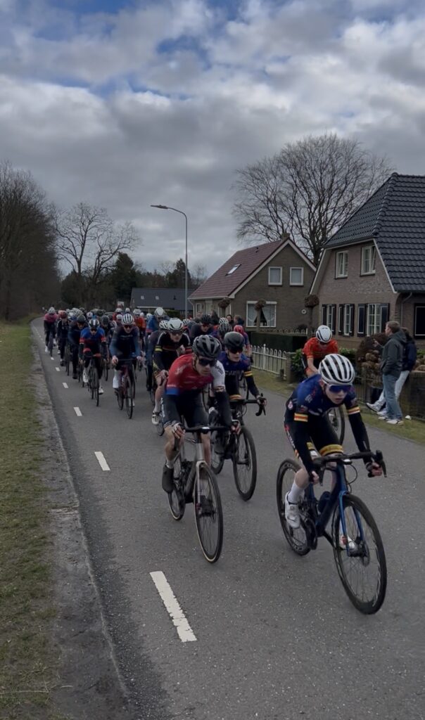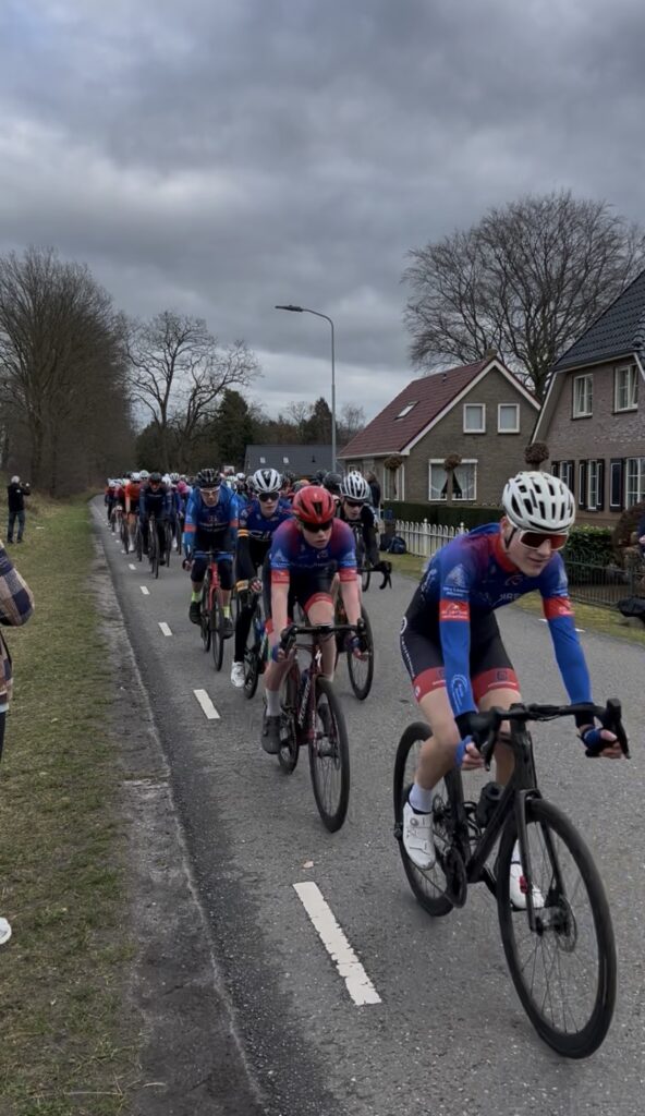 Bij het B peloton waren dit keer zo’n 70 renners aan de start gesignaleerd, waaronder dus 8 WSR renners. Hiernaast zien we Hesse en Noah die elkaar gezelschap houden. Hesse werd uiteindelijk 41e, Noah kwam als 35e over de finish in de eerste groep.